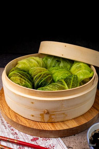 Ich przygotowanie jest naprawdę szalenie proste i szybkie. Wystarczy krótko podgotować na parze liście kapusty włoskiej (lub zblanszować je w gorącej wodzie). Dodatkowo polecam umieścić je na moment w zimnej wodzie z lodem, aby miały pięknie intensywny zielony kolor. A następnie zawinąć w nie mięsny farsz, który polega wyłącznie na posiekaniu i wymieszaniu składników. Zajmie to Wam naprawdę chwilę. Kolejno te azjatyckie gołąbki układamy w bambusowym koszyczku i krótko gotujemy na parze, a następnie zajadamy z prostym sosem na bazie sosu sojowego, czarnego octu oraz prażonego sezamu.