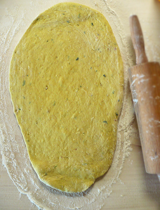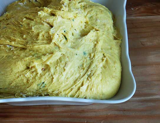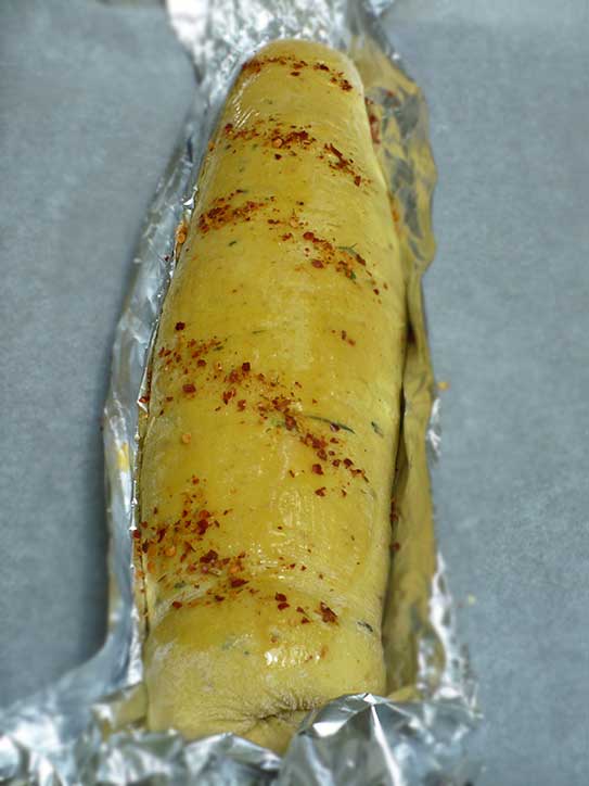 - Wierzch wyrośniętej bagietki smarujemy rozbełtanym żółtkiem z mlekiem i posypujemy przyprawami.