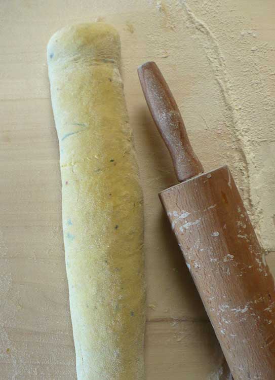 - Wyrośnięte ciasto przekładamy na stolnicę. Podsypujemy ciasto mąką i chwilę wyrabiamy. Wałkujemy je na prostokąt o długości ok. 40 cm. Zawijamy ciasno jak roladę i przekładamy na blaszkę, robiąc z folii aluminiowej „ścianki” podtrzymujące boki bagietki (widać na zdjęciu).