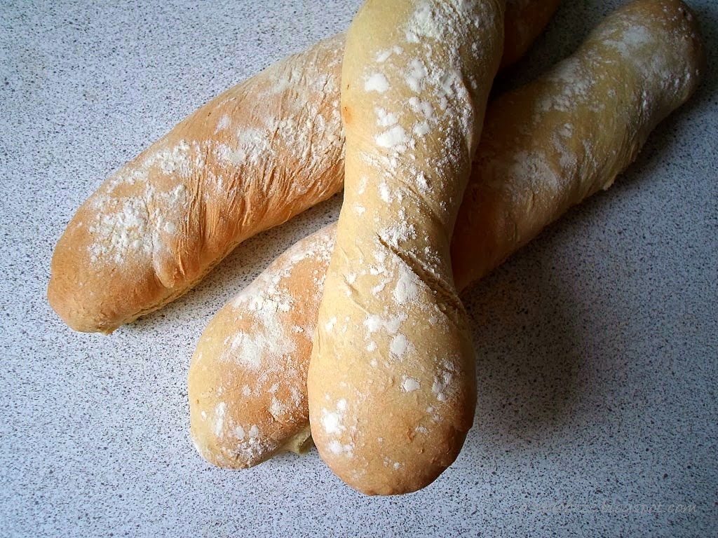 Pierwszy raz upiekłam je na nasz wakacyjny wyjazd, w ramach kanapek na drogę. Wtedy przygotowałam sześć mniejszych, które przecięłam wzdłuż na pół i przygotowałam gigantyczne kanapki. Nie zdążyłam zrobić zdjęć... Ostatnio przeglądałam folder z przepisami, i znalazłam ten. Stwierdziłam, że koniecznie trzeba je powtórzyć, i Wam pokazać, bo są naprawdę wyśmienite. Tym razem przygotowałam je w wersji pełnowymiarowej - trzy duże bagietki. Wyszły obłędne - mięciutkie, pulchniutkie i pachnące. Na trzeci dzień ponacinałam je po skosie i wypełniłam masłem i posiekanymi, świeżymi ziołami. Smakowały wspaniale.