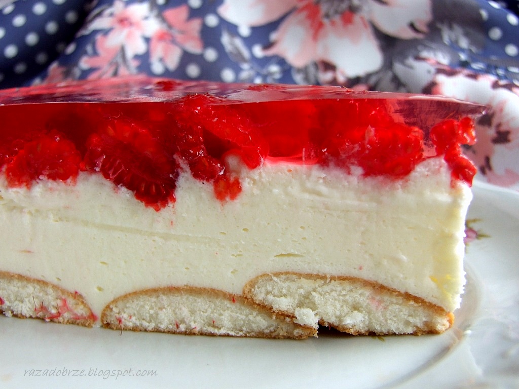 Póki co, zrobiłam sernik dla mojej Rodziny. Kupiłam mascarpone, miałam też maliny od Mamy Dużego, w związku z czym w mojej głowie powstała wizja pięknego, różowego serniczka pełnego malin. Niestety, kiedy zabrałam się do dzieła, miałam tylko trochę owoców, i moja wizja legła w gruzach. Szczerze mówiąc, nie bardzo byłam na to przygotowana, improwizowałam więc na całego. A wiecie, jak takie działania wyglądają w nieswojej kuchni... Po pierwsze nie bardzo wiem, gdzie co Mama ma. Po drugie nie wiem też, co ma w ogóle. Tak więc grzebałam w szufladach, przetrząsnęłam lodówkę, pozaglądałam do szafek, wymieszałam, co zdobyłam - i jest! A właściwie to już nie ma, bo zjedliśmy dziś z Tatą resztę. No i muszę przyznać, że jak na tak mało zorganizowane działania, wyszło coś naprawdę smacznego. W serniku czuć kalorie, więc pewnie można by go mniej procentową śmietaną odchudzić, ale nam taki właśnie smakował bardzo. Kremowy, nie za sztywny, ale też nie rozpływający się, miękki i słodki, idealnie kontrastował z kwaskowymi malinami i orzeźwiającą galaretką, które sprawiły, że całość nie jest mdła. Mówię Wam - bajka! Ale dla odważnych, bo jak ktoś się boi kalorii, to niech lepiej dalej nie czyta... Choć jak wszyscy wiemy, maliny to samo zdrowie.