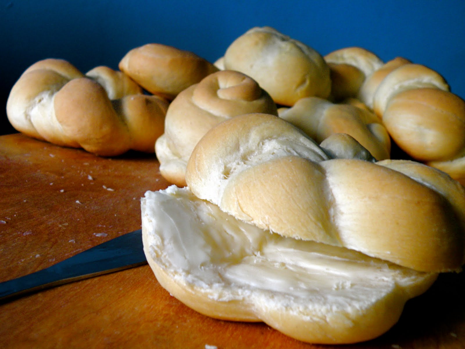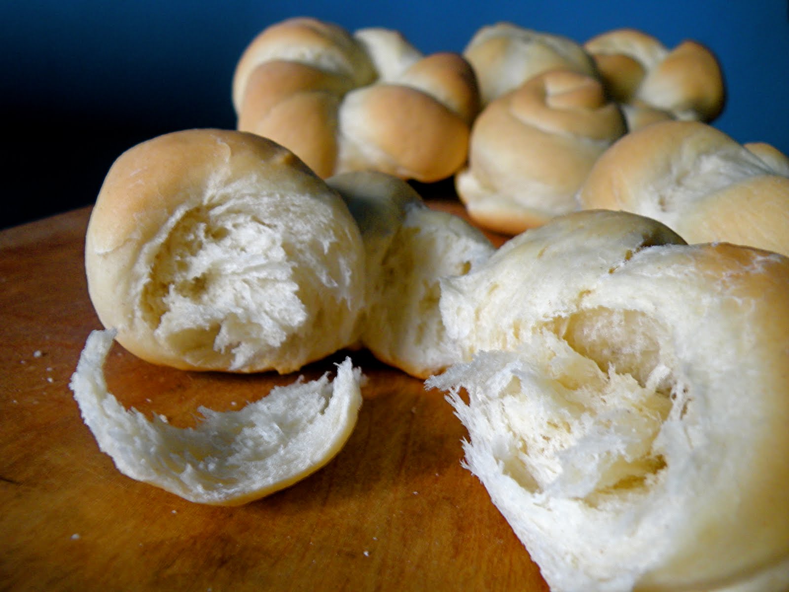 Wykonanie: Drożdże rozpuścić w ciepłym mleku (maślance lub wodzie) z cukrem i zostawić na kilka minut , aż zaczną bąbelkować. Mąkę wsypać do miski , dodać resztę składników oraz wyrośnięte drożdże i dobrze wyrobić (5-10 minut) , aż ciasto będzie gładkie i elastyczne. Przykryć i zostawić do wyrośnięcia w ciepłym miejscu na 30 minut lub do podwojenia objętości. Następnie lekko zagnieść i podzielić na 10 części. Uformować bułeczki, poukładać na blasze w co najmniej 2,5 cm odstępach i zostawić do ponownego wyrośnięcia. Piec 10-15 minut w temp. 220 st.C". Metody zaplatania tu i tu i według własnych upodobań.