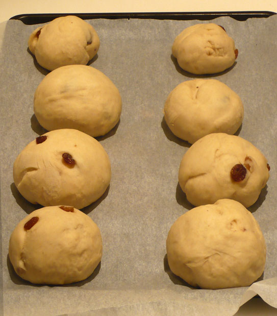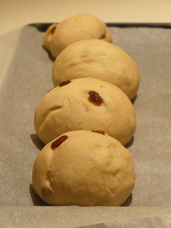 - Po godzinie wyrośnięte ciasto dzielimy na 6-8 części i z każdej z nich formujemy okrągłą bułeczkę. Przyszłe bułeczki kładziemy na blasze wyłożonej pergaminem, przykrywamy ściereczką i zostawiamy do wyrośnięcia na 30 minut.