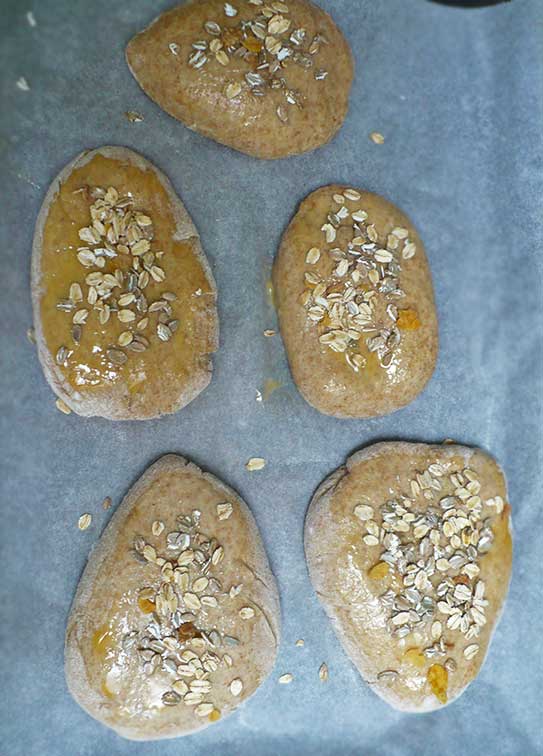 - Wierzch bułeczek smarujemy rozbełtanym jajkiem, posypujemy ulubionymi ziarnami, przyprawą lub płatkami owsianymi/żytnimi.