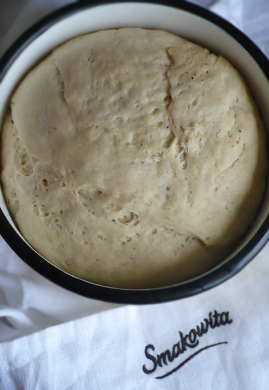 - Powoli zaczynamy wlewać płyn i wyrabiać ciasto. Po kilku minutach zagniatania (mikserem lub ręką) ciasto osiągnie formę elastycznej kuli. Przekładamy ją do misy oprószonej mąką, przykrywamy folią spożywczą i stawiamy w ciepłym miejscu bez przeciągów.