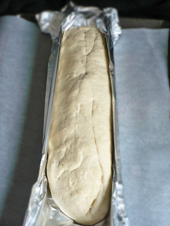 - Blachę wykładamy papierem do pieczenia. Pergamin przykrywamy folią aluminiową, na którą kładziemy ciasto. Z folii formujemy ścianki, które będą podtrzymywały bagietkę (widoczne na zdjęciu). Całość przykrywamy czystą ściereczką i zostawiamy do wyrośnięcia na 30 minut.