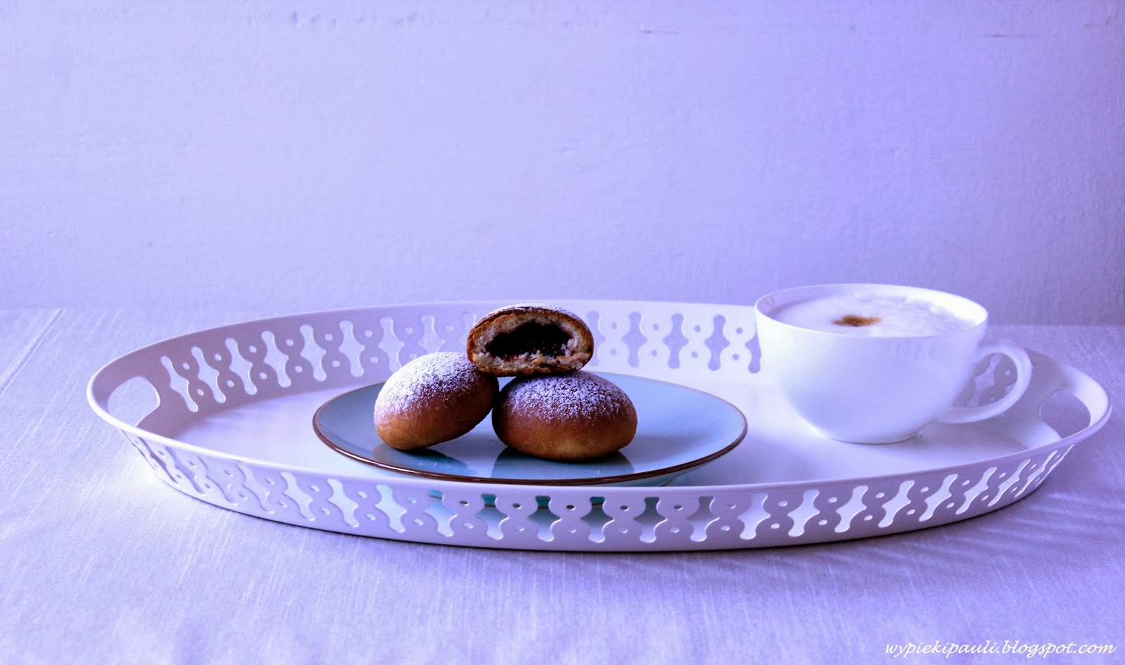 Po tym czasie zabieramy się za lepienie bułek. Ciasto podzielić na ok. 13 równych części. Każdą część formujemy w kulkę i rozpłaszczamy ręką. Na środek kładziemy niepełną płaską łyżeczką dżemu. Brzegi sklejamy w jednym miejscu, aby utworzyć taką sakiewkę. Układamy na blaszce wyłożonej papierem do pieczenia sakiewki sklejeniem do dołu. Blaszkę z bułkami przykryć ściereczką i odstawić w ciepłe miejsce na godzinę.