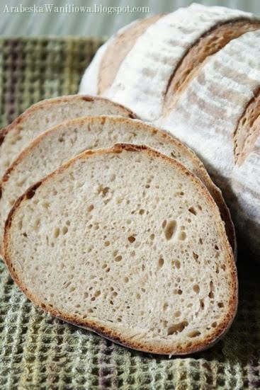 Przed wsunięciem bochenka do pieca, wierzch naciąć. Piec z parą 15 minut w 250 st.C, później kolejne 30 minut już bez pary , zmniejszając temperaturę do 200 st.C.