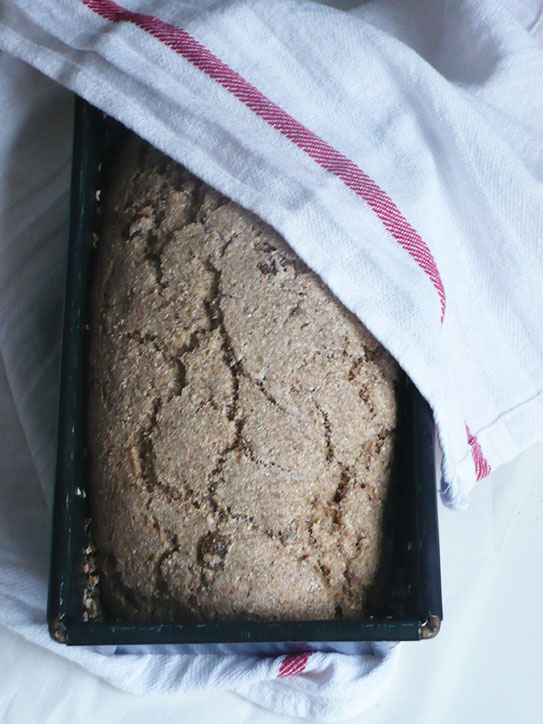 - Keksówkę smarujemy oliwą i obsypujemy otrębowami. Z ciasta chlebowego formujemy podłużny bochenek i przekładamy je do formy. Przykrywamy ściereczką i zostawiamy w cieple na 2- 2,5 godziny.