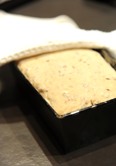 - Prostokątną formę o długości ok. 15 cm wyłóż papierem do pieczenia. Umieść w środku ciasto, lekko uklep, przykryj materiałową szmatką i odstaw w ciepłe miejsce (na przykład niedaleko rozgrzanego kaloryfera) na ok. 2-2,5 godziny.