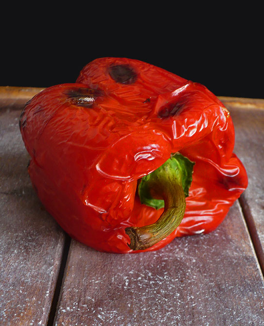 - Piekarnik nagrzewamy do 200 stopni i włączamy tryb termoobieg. Do rozgrzanego piekarnika wkładamy całą umytą paprykę i podpiekamy przed 25 minut. Upieczona papryka będzie miała miejscami ciemną skórkę i będzie pomarszczona.