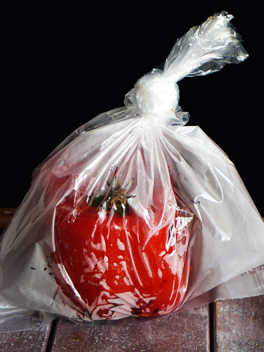 - Taką paprykę przekładamy do foliowego woreczka i zawiązujemy go. Zostawiamy ją tak przez kilka minut. W tym czasie papryka się „spoci”. Następnie paprykę obieramy ze skórki i kroimy w drobną kostkę.