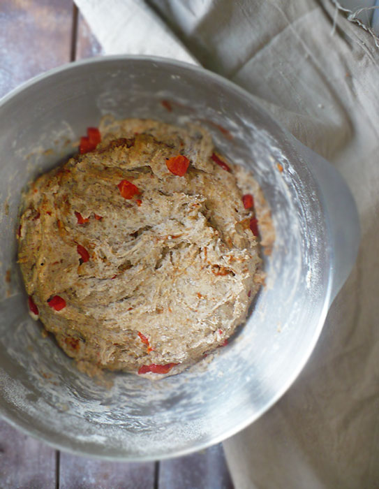 - Mąkę przesiewamy do misy. Mieszamy z dokarmionym zakwasem. Dodajemy sól i cukier. Stopniowo wlewając letnią wodę, zaczynamy wyrabiać ciasto. Gdy woda się skończy, dorzucamy partiami kawałki papryki oraz przyprawę i jeszcze chwilę mieszamy ze sobą składniki. Ciasto przekładamy do oprószonej mąką misy na 2-2,5 godziny. Zostawiamy w ciepłym miejscu.