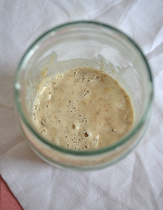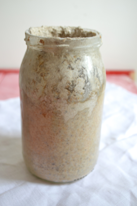 - W tym samym czasie "dokarmiamy" 15 g zakwasu, mieszanką mąki żytniej i wody. Całość mieszamy i zostawiamy w słoiku na 10 godzin, w ciepłym miejscu.