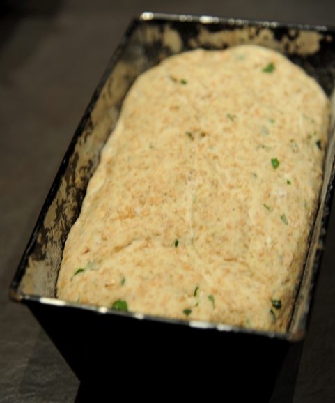- Prostokątną formę do wypieków nasmaruj tłuszczem i obsyp mąką razową na każdej ściance i dnie, aby ciasto się nie przykleiło.