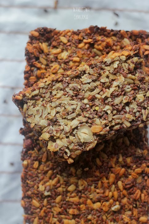 - 1 szklanka ziaren słonecznika - 3/4 szklanki siemienia lnianego - 10 czubatych łyżek zmielonego siemienia lnianego - 1/2 szklanki orzechów laskowych - 1 1/2 szklanki płatków owsianych górskich - 2 łyżeczki soli - 1 łyżka syropu z agawy - 5 łyżek rozpuszczonego oleju kokosowego - 1 1/2 szklanki wody + 3 łyżki Piekarnik rozgrzać do 185 stopni. Wszystkie suche składniki wymieszać w dużej misce. W szklance wymieszać wodę, syrop z agawy i olej kokosowy. Wlać płynne składniki do suchych i dokładnie mieszać przez kilka minut. Odstawić na 1-2 godziny, aż do wchłonięcia płynów. Keksówkę posmarować cienko olejem kokosowym i przełożyć do środka masę z ziarenek. Piec przez 50-60 minut, chleb jest gotowy kiedy można w niego postukać i usłyszeć głuchy, pusty odgłos. Wyjąć z piekarnika, odstawić na godzinę do schłodzenia. Następnie delikatnie wyjąć z foremki i zostawić aż do kompletnego wystudzenia, najlepiej na całą noc. To bardzo ważne, bo nawet lekko letni chleb będzie się jeszcze kruszył. Kroić cienkim i ostrym nożem. Smacznego!:)