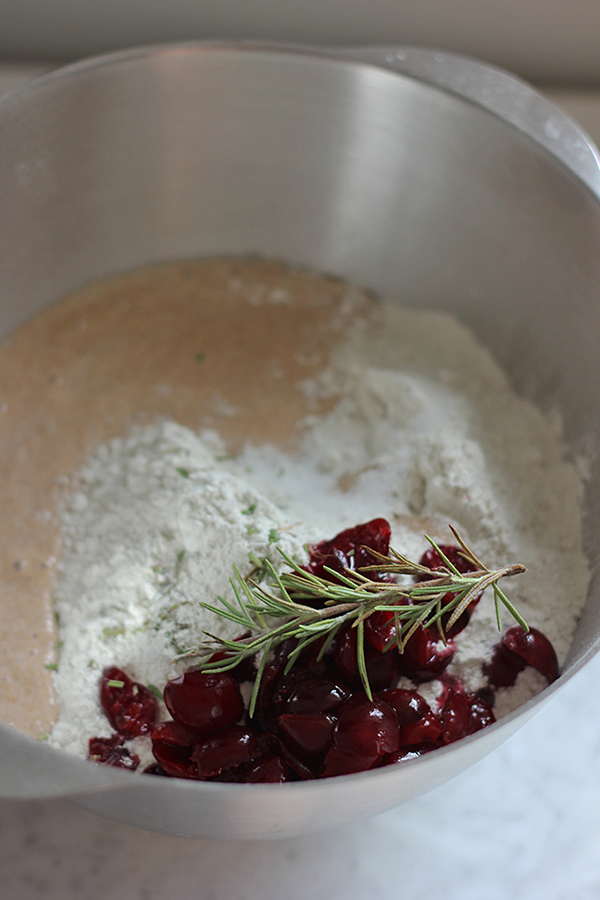 - Do misy wsypujemy mąkę, dodajemy zakwas, wydrylowane połówki wiśni, posiekany rozmaryn i sól. Wlewamy letnią wodę i mieszamy krótko ciasto jedynie do dokładnego połączenia składników.