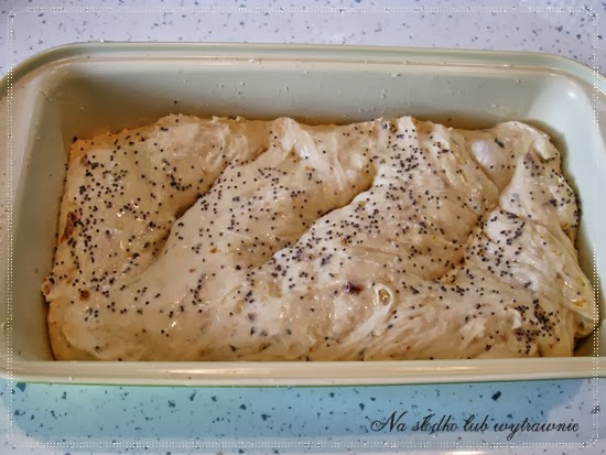 Gdy ciasto podrośnie można je naciąć a następnie posmarować wierzch rozmąconym jajkiem zmieszanym z łyżką mleka i posypać makiem lub innymi ziarnami