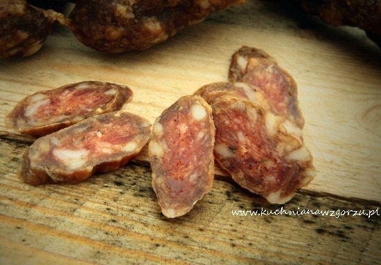Kiełbasa jest pyszna jako dodatek do czerwonego wina, ale też np. do jajek sadzonych, jajecznicy, makaronu.