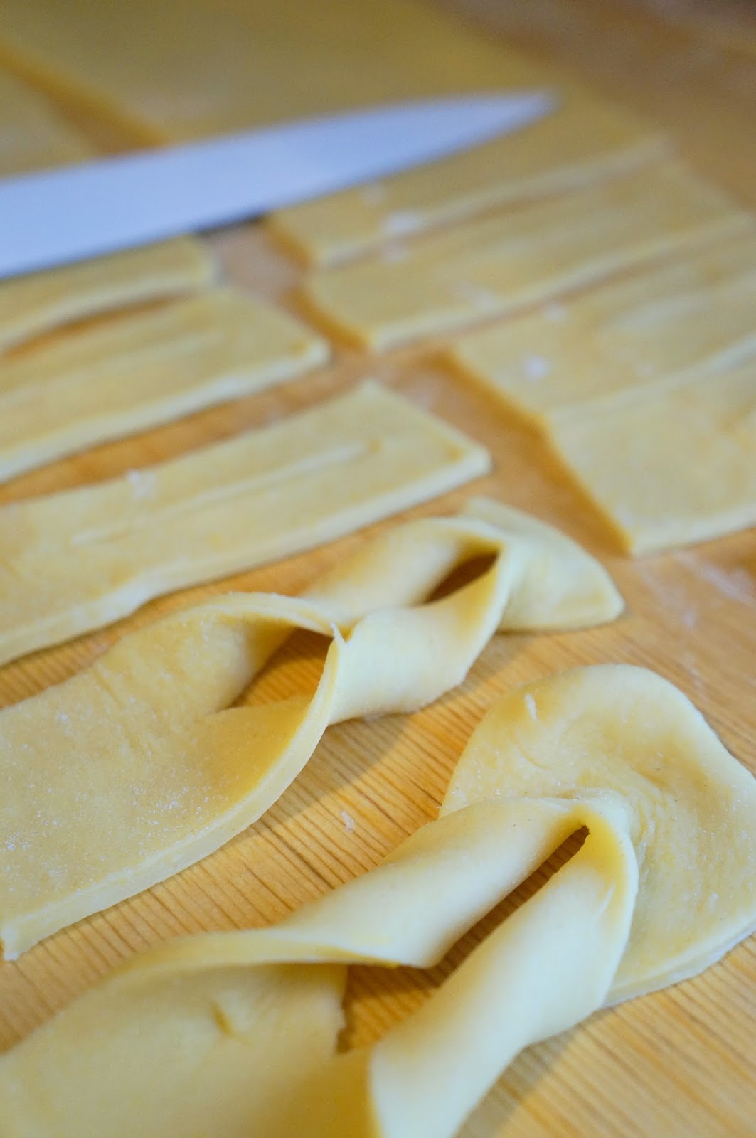 Mąkę przesiej na stolnicę, dodaj masło i posiekaj z mąką. Następnie wbij jajka, dodaj odrobinę soli, śmietanę i rum lub spirytus. Wyrabiaj ciasto tak długo, aż będzie gładkie i jednolite, a na przekroju pojawią się drobne otworki powietrza.Przygotowane ciasto podziel na części. Każdą rozwałkuj na cienki placek i ostrym nożem pokrój na pasy o długości ok 10 cm i szerokości 3 cm. Na środku każdego paska zrób nacięcie i przewiń przez nie ciasto. Następnie przełóż na blachę wyłożoną papierem do pieczenia, delikatnie posmaruj wodą z cukrem i upiecz na złoty kolor w temp ok 200 C. Gotowe od razu obficie posyp cukrem pudrem.