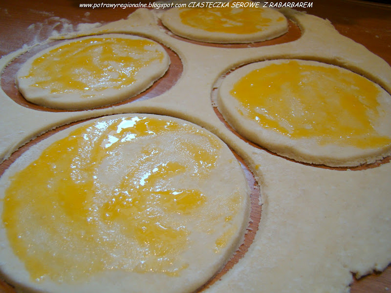 Podzieliłam ciasto na dwie części. Rozwałkowałam, podsypując mąką na grubość około 1/2 cm.Wykraiwywałam koła o średnicy 12-15 cm. Posmarowałam żółtkiem.