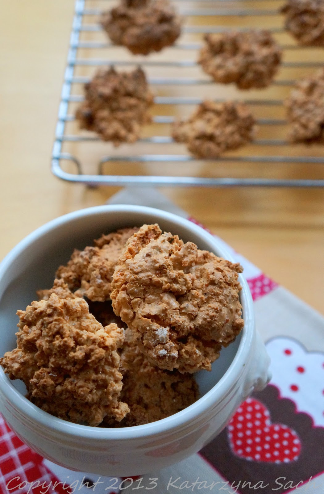 … czyli ciasteczka brzydkie ale dobre:) Osobiście nie zgadzam się z ich nazwą, bo ani nie są brzydkie (mają swój urok), ani nie są dobre... Są przepyszne! Zdecydowanie najlepsze ciasteczka na bazie białek jakie jadłam. Po wystudzeniu twardawe i mocno chrupiące. W smaku idealne, nie za słodkie no i orzechowe. Warte każdej minuty poświęconej ich przygotowaniu, wynagradzające mały stres związany z metodą jaką są wykonywane (bałam się, że po rozpoczęciu smażenia, masa z białek zmieni się w jedną wielką orzechową jajecznicę). Jedyną wadą ciasteczek jest to, że znikają w zastraszającym tempie.