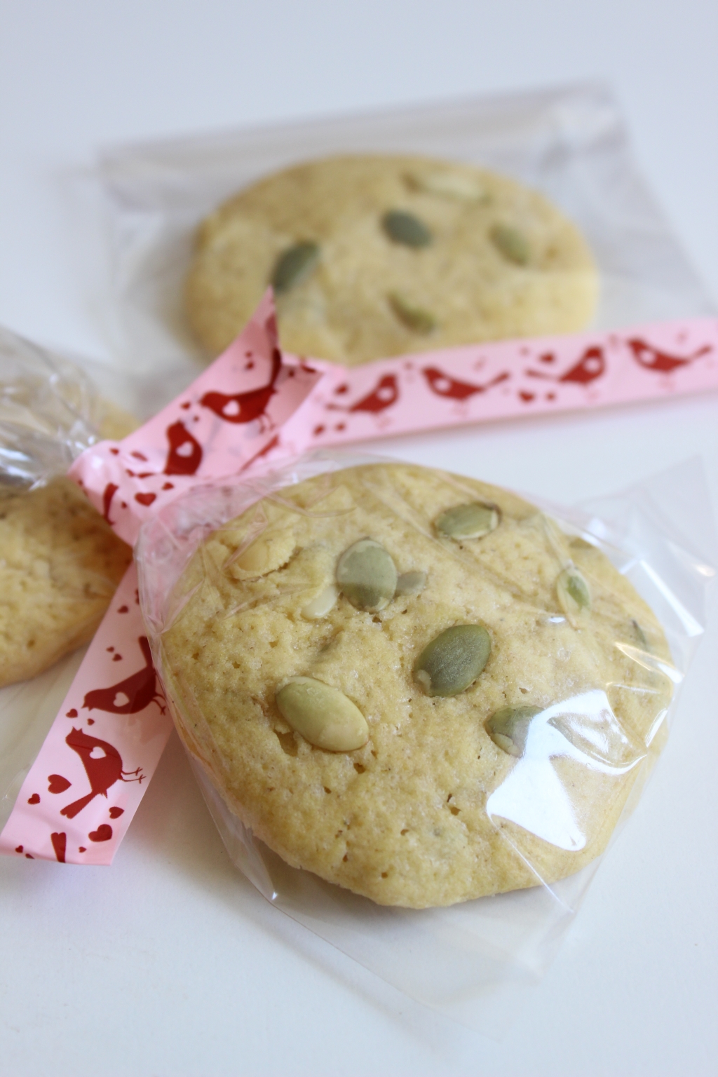 Składniki (25szt.): 100g mąki owsianej, 100g mąki kukurydzianej, 70g cukru, 100g margaryny, łyżeczka proszku do pieczenia, jajko, 4 łyżki pestek z dyni + odrobina pestek do przyozdobienia ciastek z wierzchu