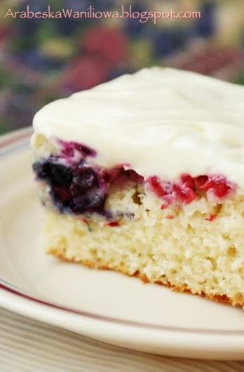 Czy może być coś prostszego do upieczenia niż muffiny ? Ano może - ciasto muffinowe ! Skorzystałam z przepisu na typowe muffiny z jagodami i zamiast upiec je w małych foremkach , zrobiłam jedno , duże ciasto. Jednak owoców nie mieszałam z ciastem , jak podaje podstawowy przepis , tylko wysypałam na wierzchu. Po upieczeniu natomiast, całość posmarowałam kremem , który zresztą już od dawna chciałam wypróbować.