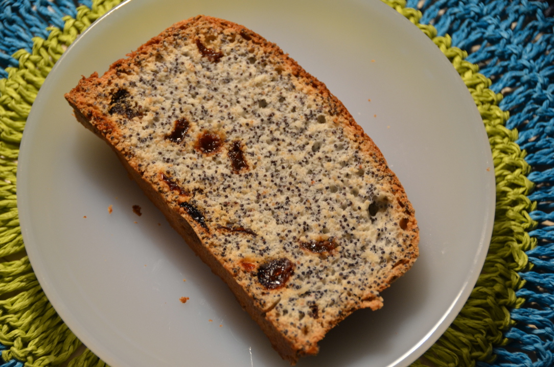 Białka ubić na sztywno, dosypując stopniowo cukier. Mąkę wymieszać z proszkiem i dosypywać powoli do białek, wsypać mak, wlać masło, dodać bakalie, wymieszać. Piec w formie keksówce około 50 minut w temperaturze 200 stopni.