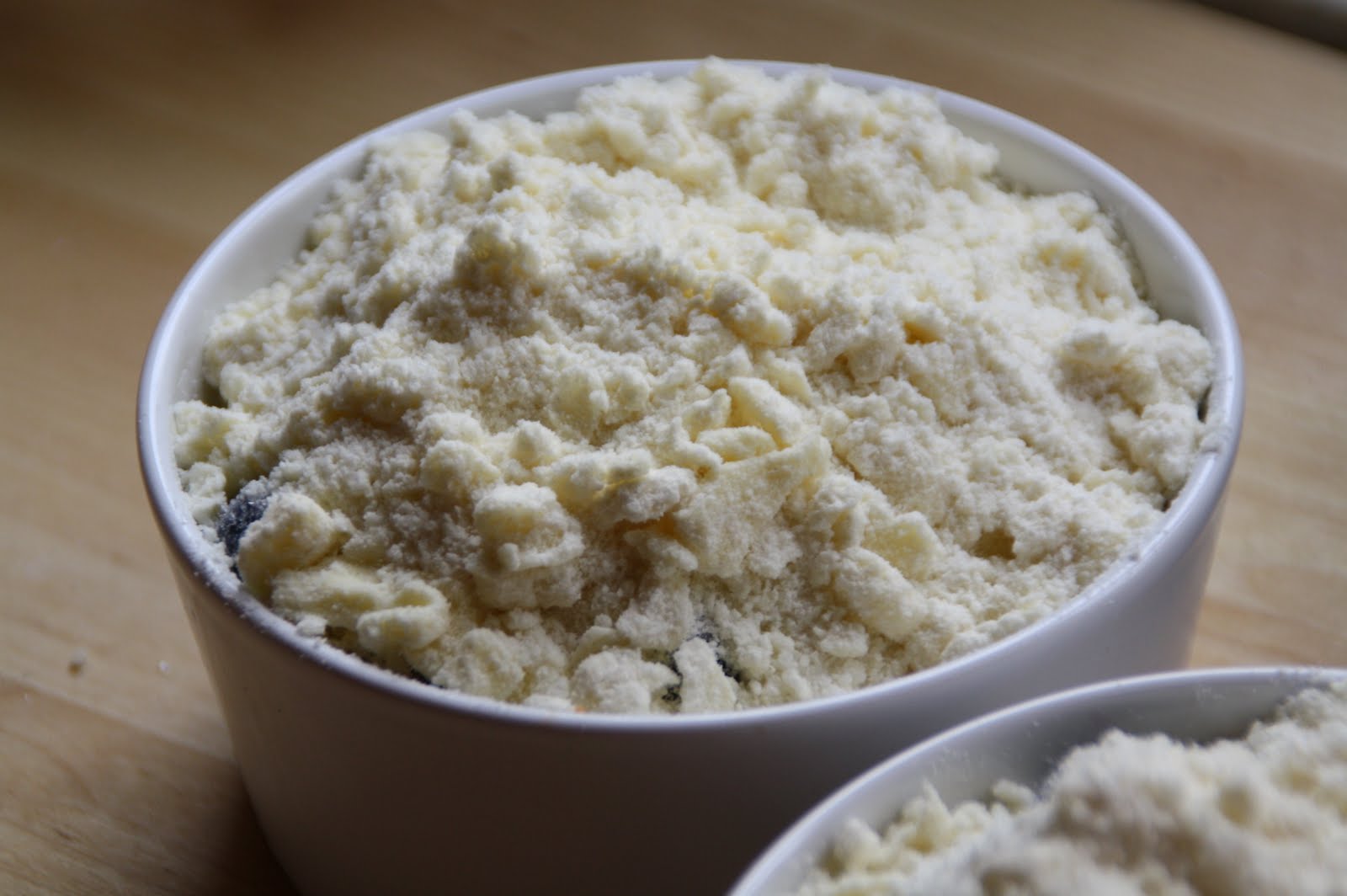 Każdą porcje posypujemy łyżką cukru. Mieszamy 75g cukru, 75g masła i 150g mąki robiąc kruszonkę - czyli mają zostać grudki.