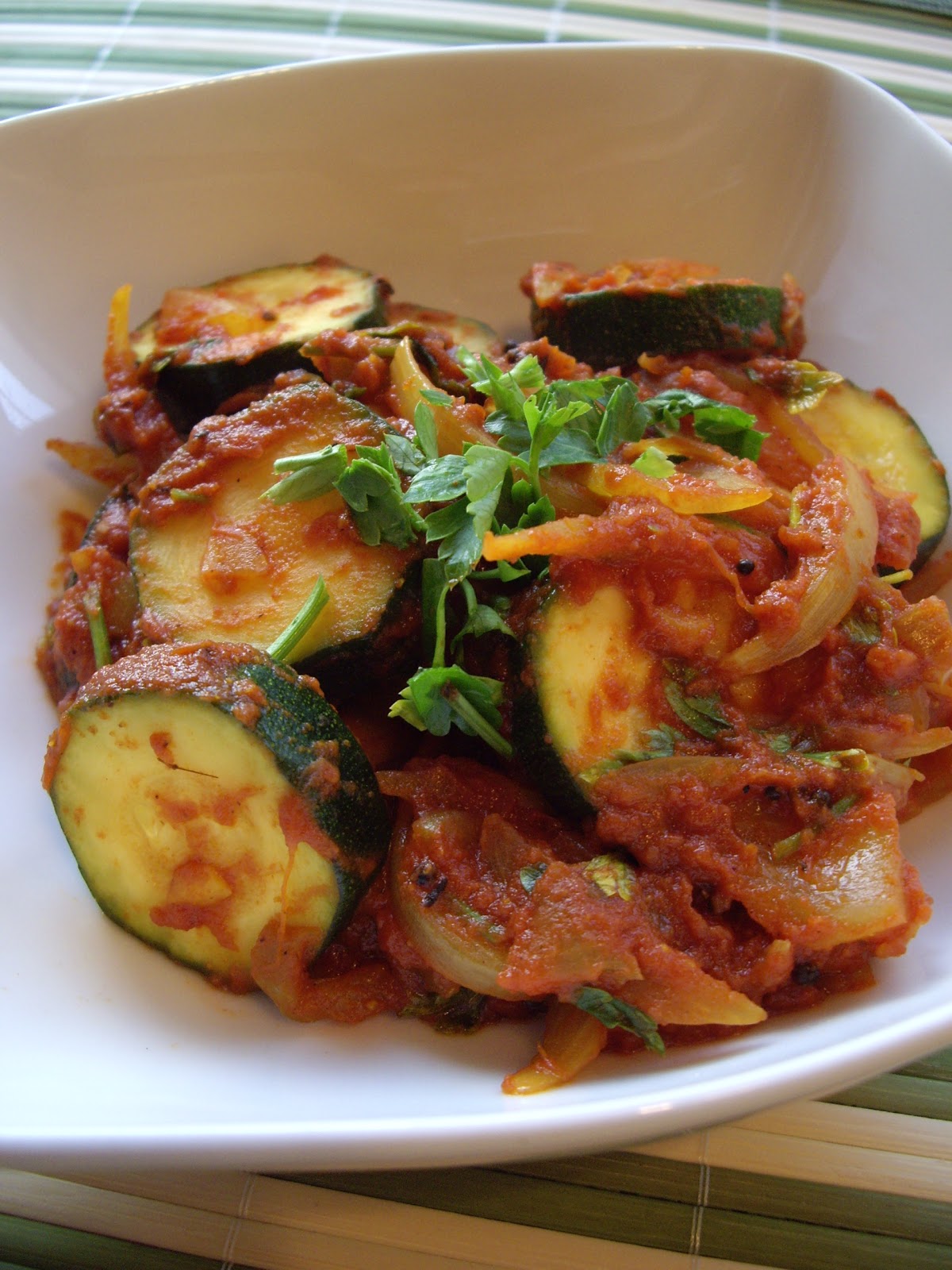 Wracając do domu kupiłam cukinię, tak po prostu. Potem za bardzo nie wiedziałam, co zrobić na obiad, bo nie miałam zbyt wielu odpowiednich składników i co przyszedł mi do głowy jakiś przepis z jej wykorzystaniem, nie mogłam go wykorzystać (sklep jest przecież tak daleeeko;D) Trafiłam na szczęście na to danie w moim nowym nabytku, książce "Kuchnia indyjska" wyd. Publicat. Dzięki temu zrobiłam to pyszne, pikantne curry, które może być zarówno dodatkiem do czegoś, jak i samodzielnym daniem. Przypadnie do gustu nawet osobom, które nie szaleją zbytnio za warzywami, a zwłaszcza za daniami składającymi się wyłącznie z nich;) A do tego jest niesamowicie aromatyczne i zdrowe.