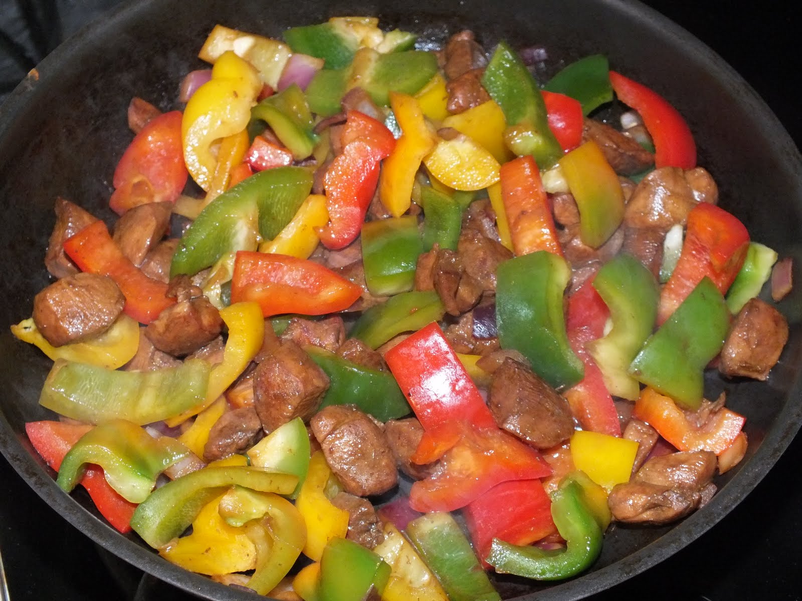 Na patelni rozgrzać łyżkę oliwy, wrzucić kurczaka i podsmażyć. Gdy mięso się zetnie, dodać paprykę, 1/4 szklanki soku z ananasa i wszystko razem poddusić.