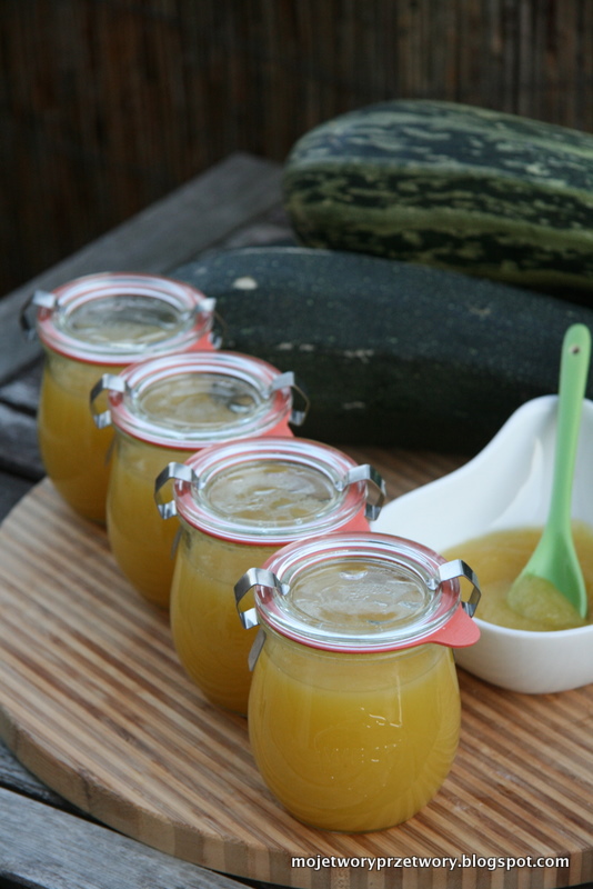 - cukinię umieszczam w garnku, podlewam wodą - około pół szklanki i gotuję do miękkości, co jakiś czas mieszając - taka ilość mieści się w garnku 5 l