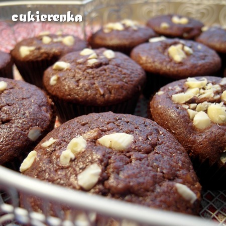 Łyżką przełóż ciasto do papilotek, tak do 3/4 wysokości. Wierzch każdej babeczki obsyp migdałami. Piecz około 20 minut tak aby babeczki ładnie wyrosły. Przed wyjęciem z piekarnika sprawdź patyczkiem czy ciasto jest upieczone w środku. Patyczek po wkłuciu powinien być suchy. Tak upieczone babeczki przełóż na kratkę do wystudzenia. Są smaczne jeszcze lekko ciepłe lub po przestudzeniu. Babeczki można udekorować keksem bitej śmietany, tu uwaga przed nałożeniem śmietany babeczki trzeba dobrze wystudzić inaczej śmietana spłynie.