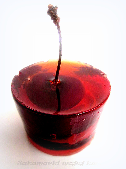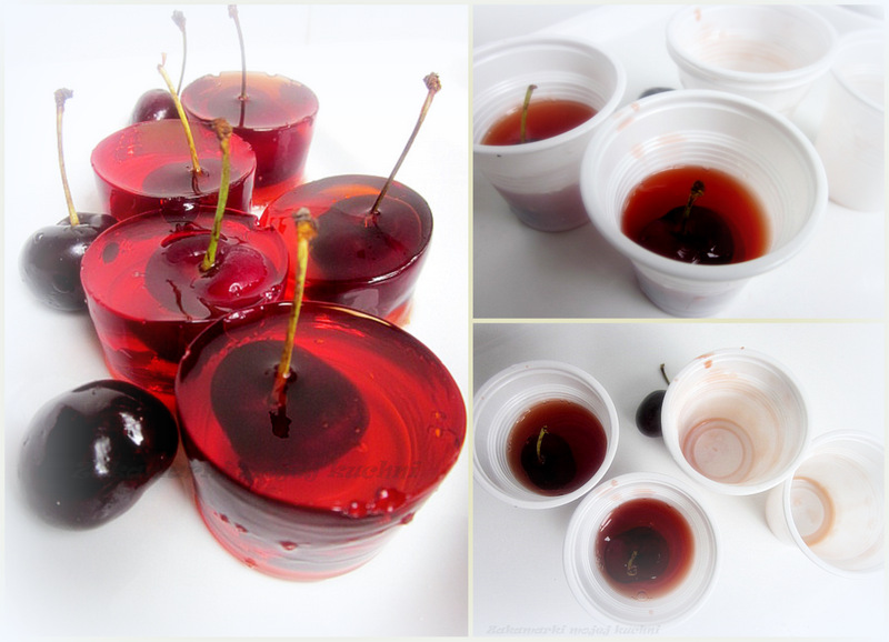 Wykonanie: -Galaretkę rozpuścić w 1,5 szklanki gorącej wody, dokładnie wymieszać i odstawić do przestudzenia. -Przygotować10- 12 pojemniczków / u mnie plastikowe kubeczki 80 ml/. -Czereśnie umyć /ogonek pozostawić/. -Do każdego pojemniczka włożyć po jednej czereśni . -Zimną galaretkę połączyć z likieremi zalać owoce tak, by były całkowicie zanurzone. -Pojemniczki ułożyć na tacy i wstawić do lodówki. -Podawać kiedy galaretka całkowicie stężeje . -Pojemniczek wystarczy na moment włożyć do ciepłej wody, a galaretka z czereśnią wyskoczy bez problemu.