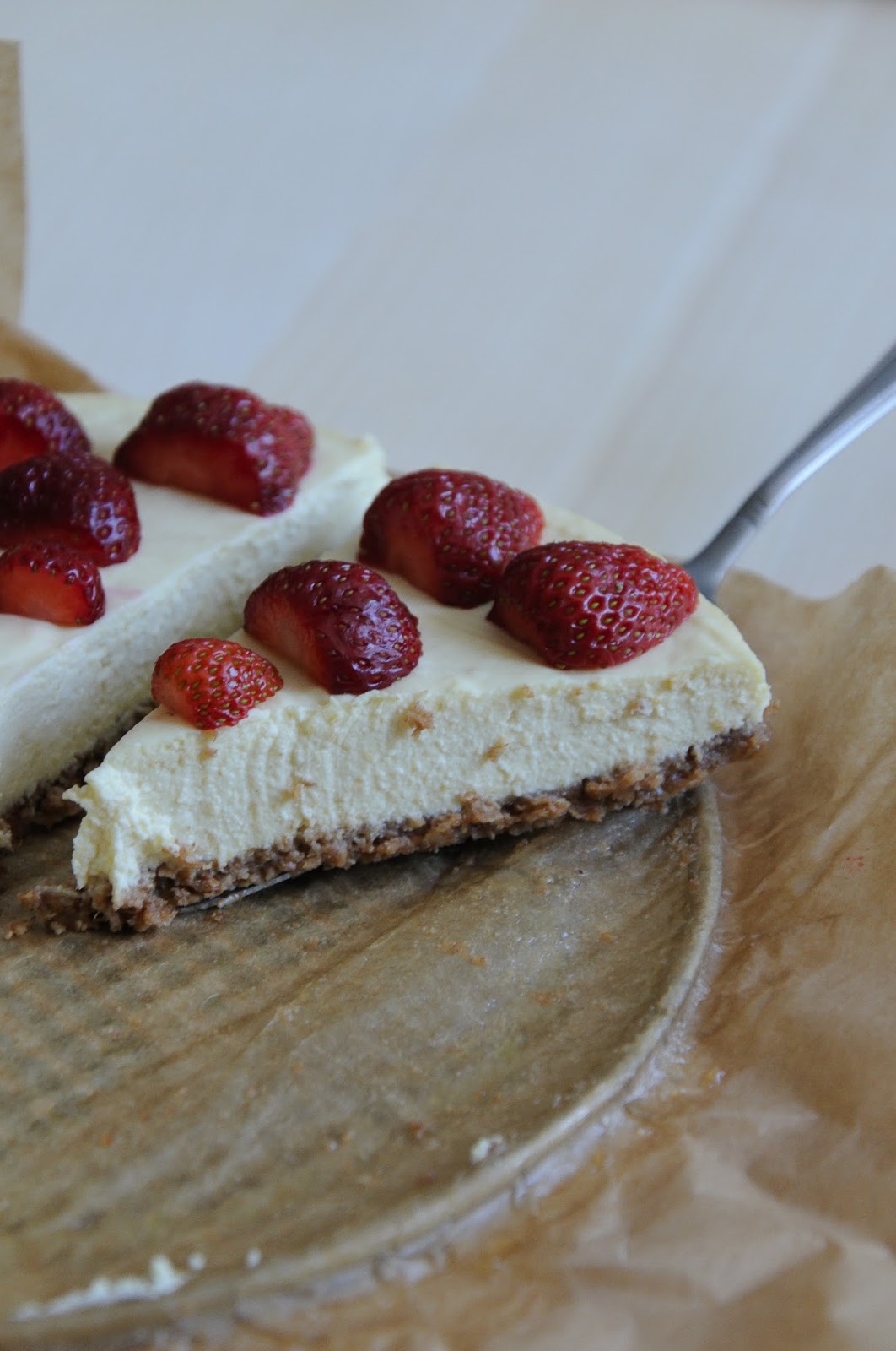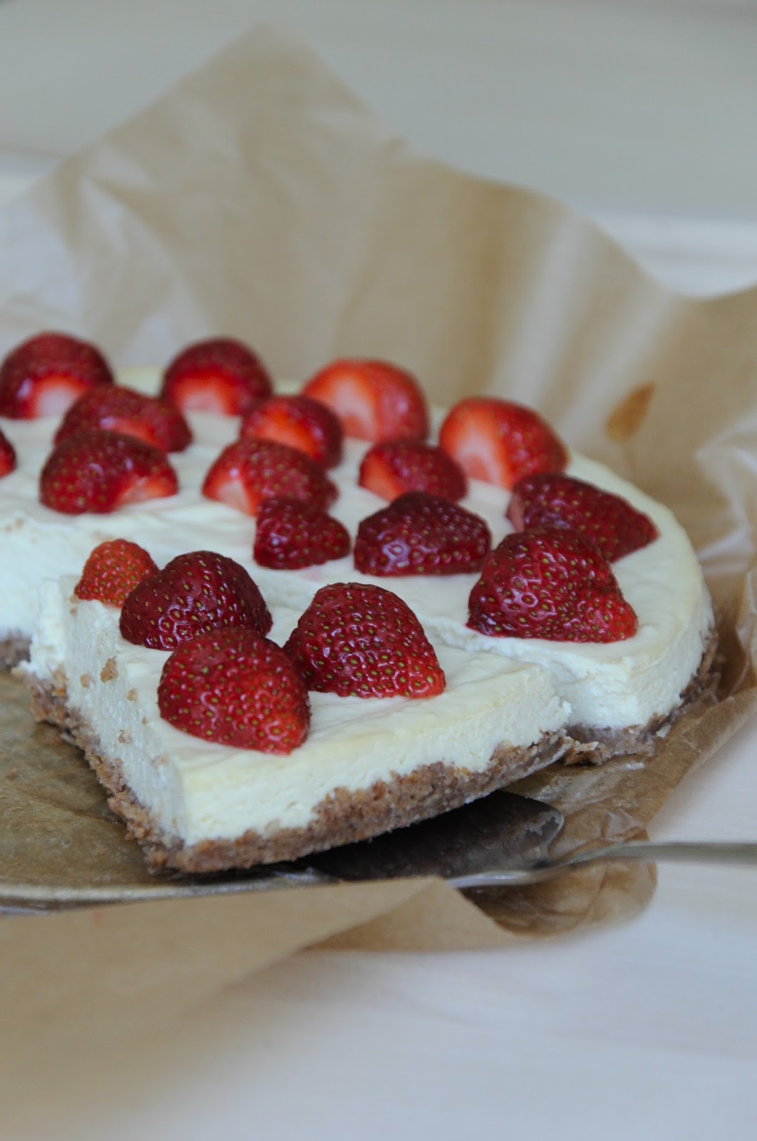 Jest to przepyszny, w miarę dietetyczny i lekki serniczek. Pieczony w kąpieli wodnej, ale smakuje jak "na zimno". Słodyczy nadaje mu soczyste mango. Masa serowa to ricotta i twaróg. W spodzie połączyłam ciasteczka owsiane z otrębami. Całość wykończyłam moimi ukochanymi truskawkami. Co więcej można się zajadać tym ciastem zaraz po ostudzeniu. Po prostu jest idealne na takie gorące dnie :) Zapraszam!