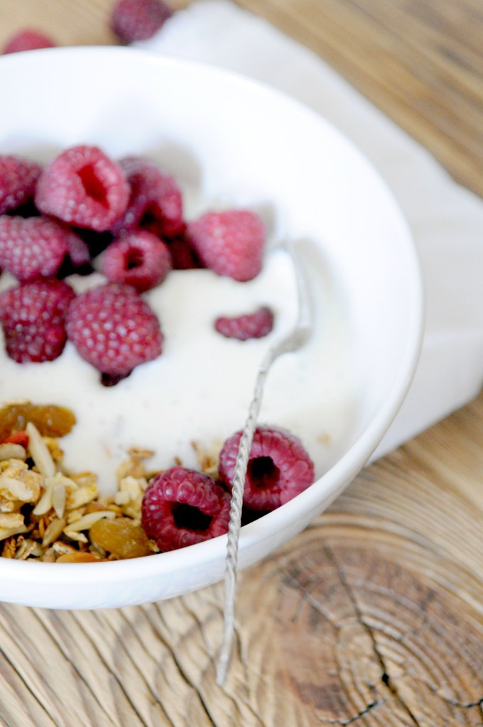 Granola smakuje fantastycznie ze schłodzonym kefirem, maślanką czy jogurtem naturalnym. Z dodatkiem sezonowych owoców.