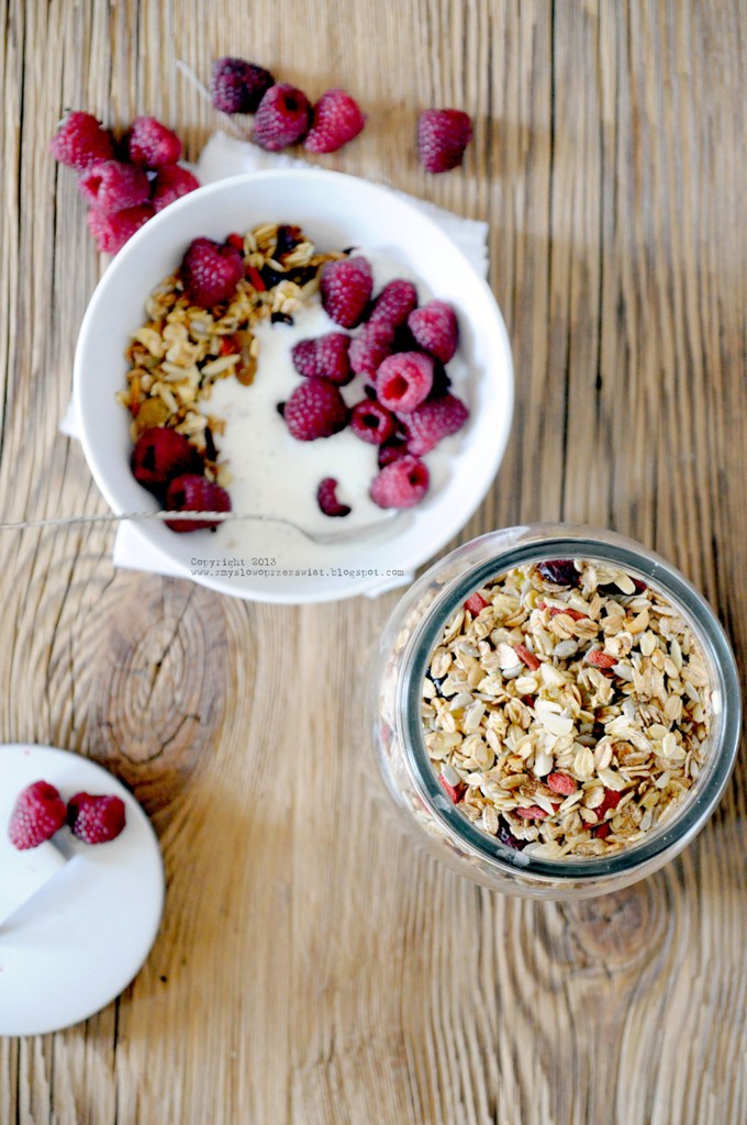 Do granoli ponownie przekonała mnie Basia (dzięki Kochana! :*), serwując mi na śniadanie solidny talerz tegoż specjału. Przepadłam... Teraz słój pełen musli na dobre wkomponował się w kuchenny krajobraz, a ja nie wyobrażam sobie lepszego, szybkiego i pożywnego śniadania (które wcześniej notabene, nie zawsze jadłam...)