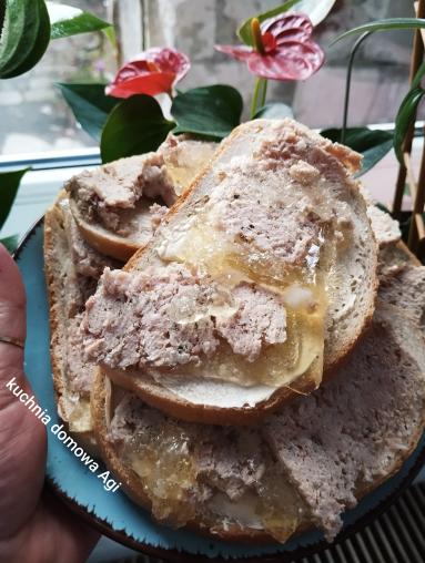Gdy już mamy wyjęte wszystkie ostygnięte słoiki z garnka wtedy włożyć je do lodówki na co najmniej 2 godziny lecz można na dłużej aby zastygły i aby zrobiła się galaretka (również będzie widoczna na zdjęciach), po wyznaczonym czasie wystarczy nożem w koło słoika obkroić i wtedy idealnie cała wyjdzie ze słoika. Ja nie dodaję żadnych żelatyn gdyż nie jestem ich zwolennikiem gotową konserwę przełożona na talerz wystarczy dowolnie kroić i kłaść na kanapkę (ja kroiłam wzdłuż ale można też kroić kładąc konserwę i wtedy będą kółka czyli okrągłe plastry. Dodam od siebie że konserwa nie jest sucha a świetnie wilgotna a co najważniejsze doprawiona idealnie nie jest za słona taka w sam raz, bardzo serdecznie polecam przygotowanie swojskiej wędliny wtedy wiemy co jemy. Zapewniam że to nie będzie moja ostatnia konserwa będę testowała również innego rodzaju