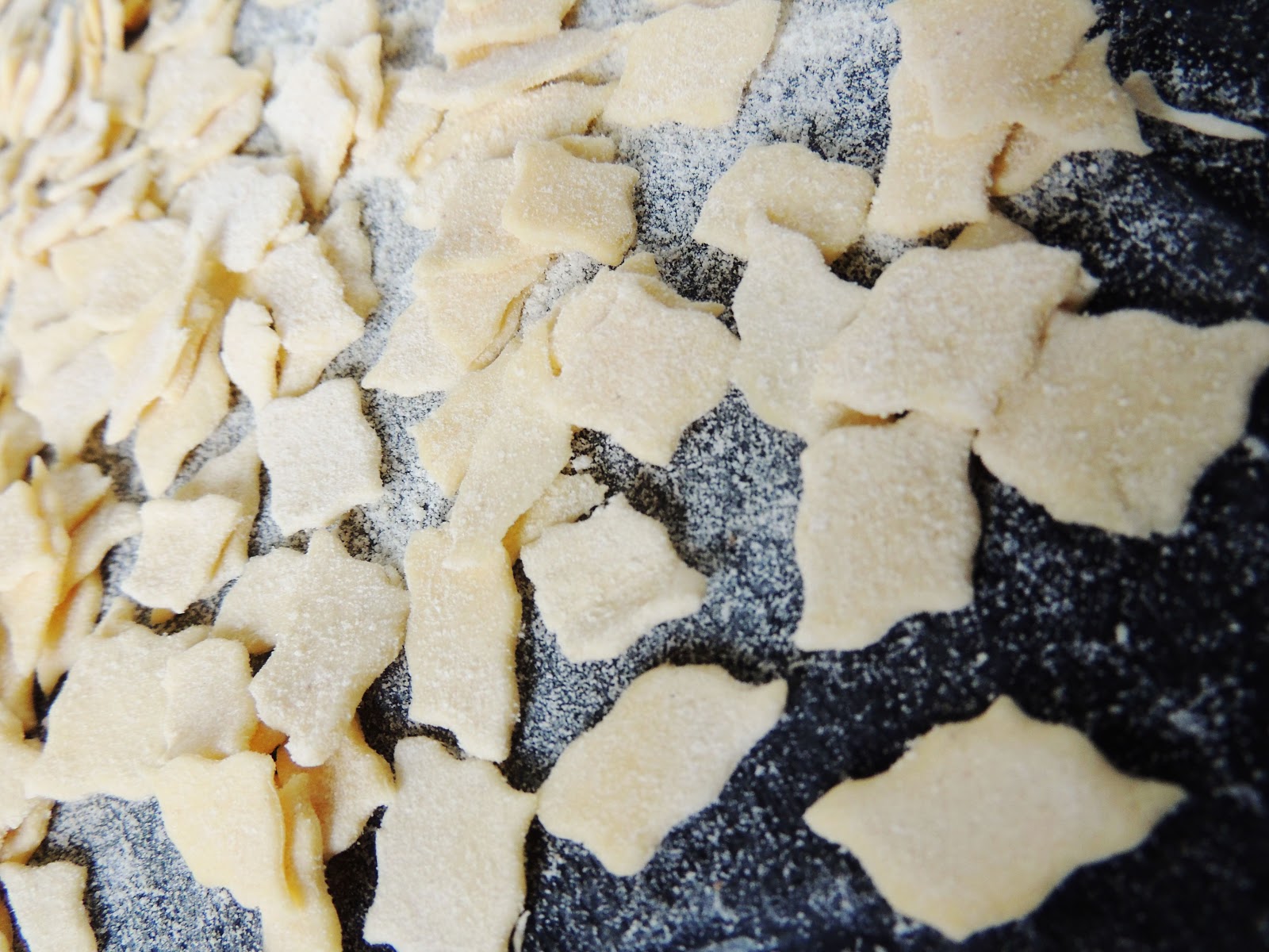 Po tym czasie każdą część ciasta rozwałkować, trochę grubiej niż na makaron.