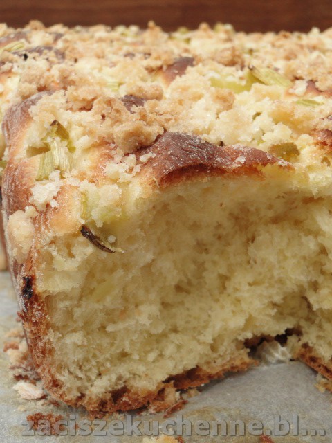 Przygotowanie: W shakerze wymieszać podgrzane mleko, jajka, cukier i drożdże. Wlać do miski, dosypać mąkę,wlać olej, wyrobić i odstawić do wyrośnięcia (mąki dosypywać tyle, żeby ciasto nie lepiło się do rąk). Kiedy ciasto podwoi swą objętość, wyłożyć na blaszkę z papierem do pieczenia, znowu poczekać chwilę na wyrośnięcie, ułożyć owoce. Wymieszać wszystkie składniki kruszonki, posypać ciasto i włożyć do piekarnika nagrzanego do 150 C, zwiększyć temperaturę do 180 C i piec około 40 minut. Jeśli piekarnik z nawiewem to nawet krócej. Sprawdzić patyczkiem, czy nie klei się ciasto, żeby nie było zakalca.