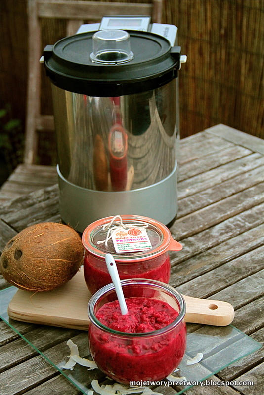 - wiórki kokosowe przelać wrzątkiem, dodać do porzeczek, zostawić takie same ustawienia i pogotować kolejne 10 minut