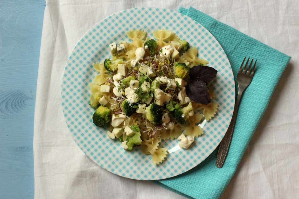 Makaron gotujemy al dente, odcedzamy i lekko skrapiamy oliwą. Brokuła dzielimy na różyczki i wrzucamy do gotującej się, osolonej wody i gotujemy ok.7 minut pod przykryciem. Następnie odcedzamy. Ser kroimy w kostkę, kiełki i zioła płuczemy. Do śmietany przeciskamy ząbek czosnku, doprawiamy solą i pieprzem.