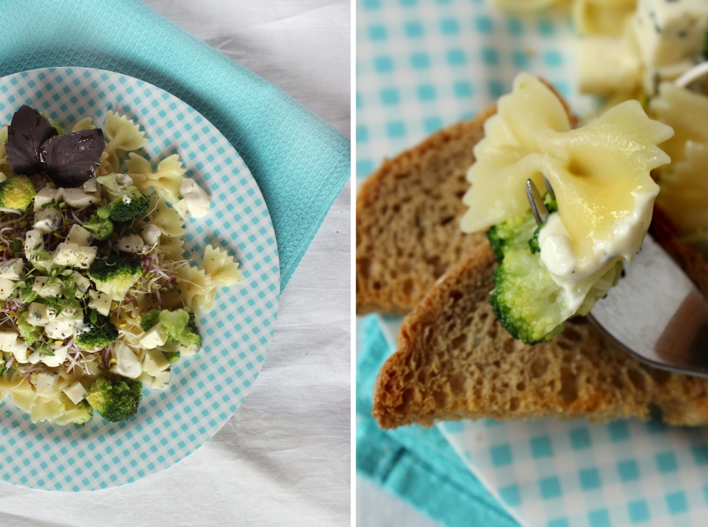 Przy pierwszej wizycie w sklepie, zakupiłam małe opakowanie kiełków brokuła i nie wiedząc co z nimi począć stworzyłam makaronową sałatkę. Ponieważ jednak tego dnia, już dawno zaszło słonko, a sałatka wyszła pyszna, postanowiłam powtórzyć moje danie jeszcze raz by móc się nim z Wami podzielić. Za drugim razem użyłam kiełków rzodkiewki, wyszło równie smacznie, choć osobiście bardziej smakowały mi delikatniejsze w smaku kiełki brokuła.