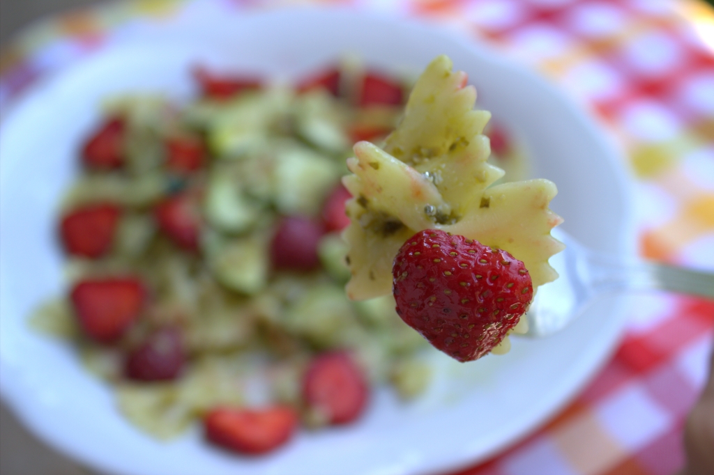 Farfalle z truskawkami cukinią i pesto
