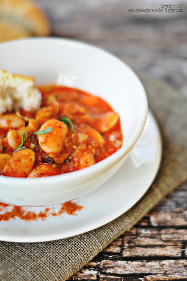 400 g fasoli 'Piękny Jaś', uprzednio namoczonej, ok. 1,5 - 2 kg dojrzałych pomidorów, 2 łyżki oliwy, 1 cebula, drobno posiekana, 3 ząbki czosnku, drobno posiekane, kawałek wędzonego boczku, pokrojonego w kostkę, kawałek dobrej jakości kiełbasy /ja użyłam chudej, lekko wędzonej/, 1 łyżeczka czerwonej, ostrej papryki, szczypta mielonego pepperoncino /lub ewentualnie pieprzu cayenne/, sól i świeżo mielony pieprz, do smaku, gałązka świeżego rozmarynu, kilka gałązek świeżego tymianku, 2 łyżeczki suszonego majeranku, 1/4 łyżeczki brązowego cukru