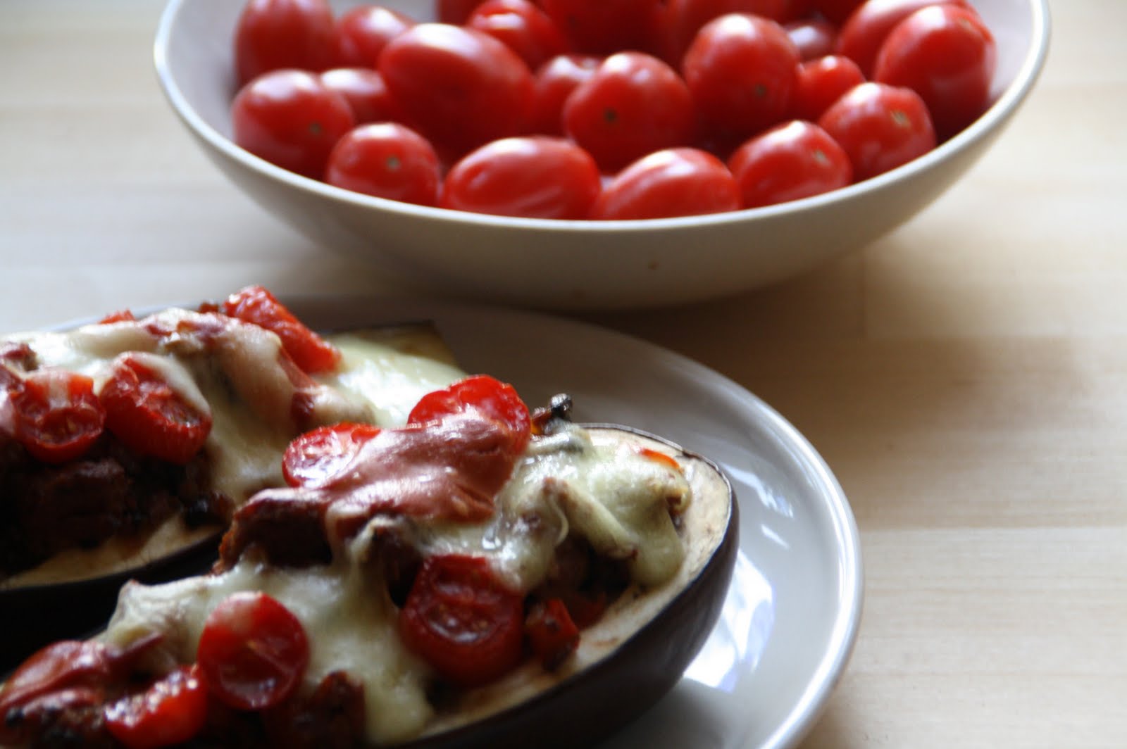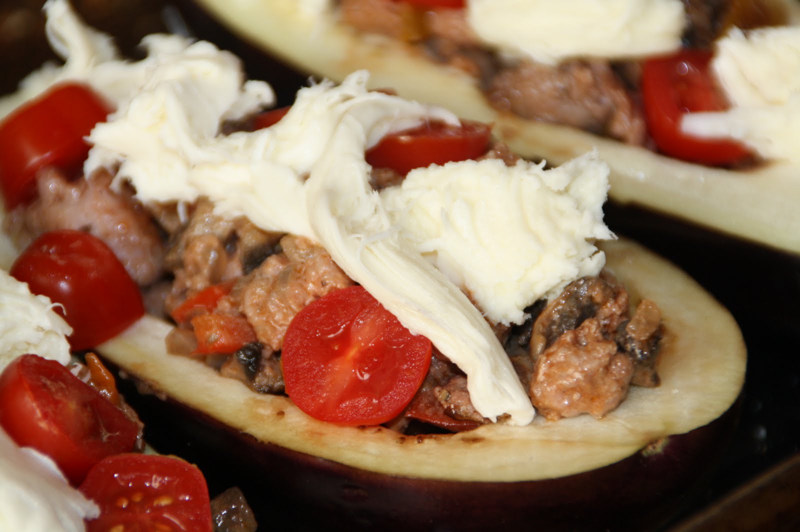 Bakłażany przekroić wzdłuż, wydrążyć miąższ i nakłuć w kilku miejscach widelcem, lekko posolić i skropić oliwą (ja nie odsączam bakłażanów). Na patelni podsmażyć doprawione mięsko, następnie drobno pokrojone pieczarki i obie cebule posiekane w drobną kosteczkę. Wszystko ze sobą wymieszać. Połączyć ze sobą koncentrat i śmietanę i dodać 2/3 do farszu, wymieszać. Wyłożyć farsz na wydrążone bakłażany, polać resztą sosu, ułożyć pomidorki i mozzarellę. Zapiekać w temp 180 stopni około 30-40 minut w zależności od wielkości bakłażanów.
