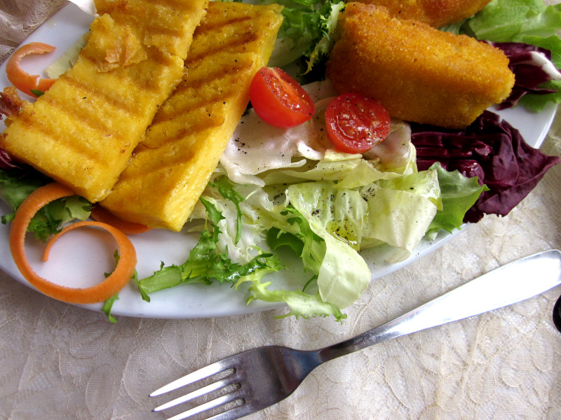 Ryba w panierce kukurydzianej z grillowaną polentą i bukietem świeżych warzyw.