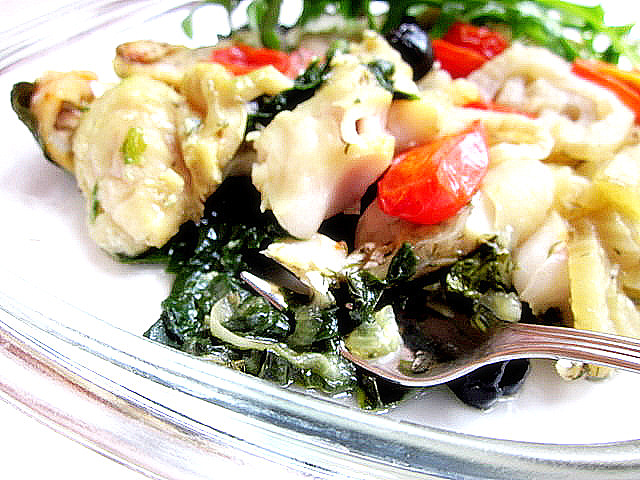 -Ułożyć liście szpinaku, na nim położyć filet.