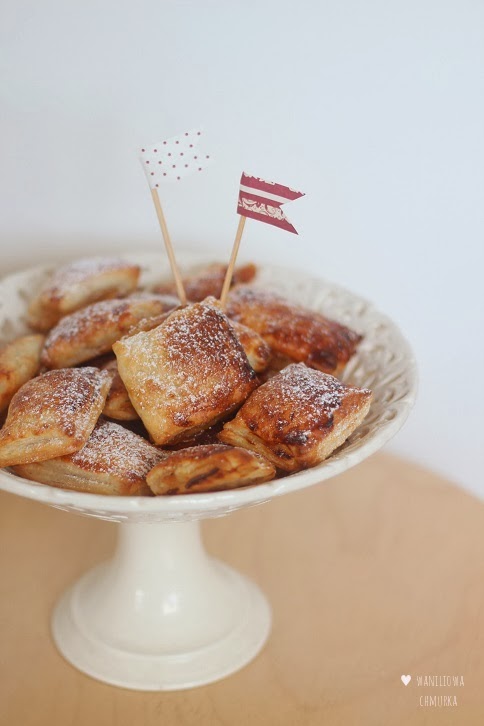 Jabłka umyj i obierz, oczyść z gniazd nasiennych. Pokrój na kawałki i wrzuć do rondelka, dodaj 3 łyżki cukru brązowego i duś do momentu, aż zaczną się rozpadać. Zestaw z ognia i dodaj cynamon. Ciasto francuskie rozłóż na blacie, pokrój na kwadraciki i nadziewaj musem jabłkowym. Zlepiaj kwadracikiem jednocześnie przyciskając brzegi każdego ciastka, aby nie rozkleiło się podczas pieczenia. Na płaskiej blasze do pieczenia rozłóż papier i ciasteczka. W małym kubeczku rozkłóć żółtko, posmaruj nim kwadraty i posyp 1 łyżką cukru brązowego. Nastaw piekarnik do 180 stopni i piecz w nim ciasteczka przez 20 minut- na złoty kolor. Ostudź i posyp cukrem pudrem. Smacznego! :)